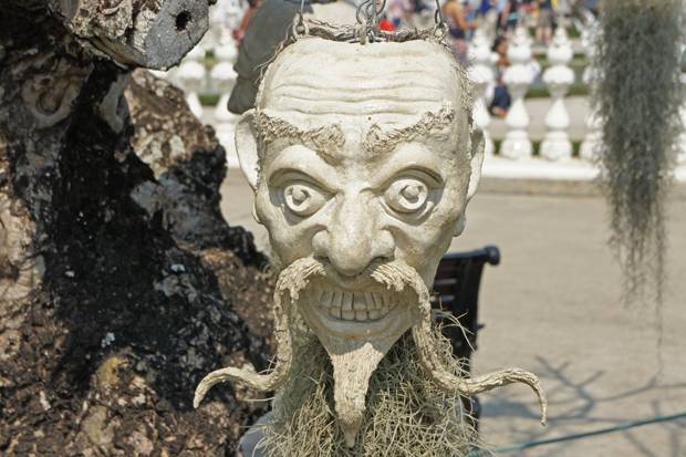 Cuando yo fui, hace una semana, me senté a tomar un café enfrente del templo y de repente salió un tío de la cafetería pegando gritos entre risas y soltando tacos en tailandés. Ese tío resultó ser Chalermchai Kositpipat, el artista de fama internacional y autor del templo. Al momento la gente empezó a pedirle fotos, y estuvo un buen rato posando con tanto estilo como el de las estrellas de cine pero con una indumentaria algo más mundana. En la siguiente foto podéis ver un retrato suyo en primer plano y él detrás haciéndose fotos con visitantes: