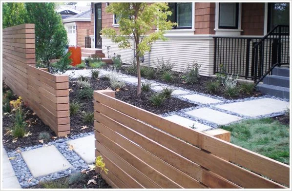 Los jardines japoneses son el epítome de los diseños minimalistas de jardines. Inyecte un poco de inspiración japonesa en su patio delantero como las cajas de madera, elementos de agua y escalones.